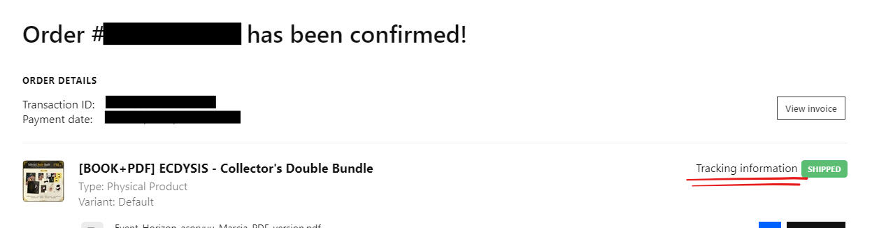 The PDFs of ECDYSIS (180pages) and Event Horizon (80 pages) can be now purchased in my ko-fi store at: ko-fi.com/marciaillust/shopUPDATE 17/07/24: As of today all the orders have been shipped out! In your email inbox you should find a confirmation email leading you to your order summary where you'll find a link to track your package labelled "tracking information". Simply click it and voilà!